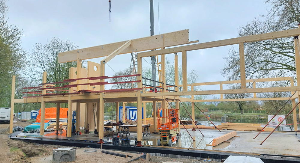 De voorbije maanden lag de focus op de planning en voorbereiding van de werfzone. Momenteel plaatst de aannemer de eerste balken van de houtstructuur. Er is gekozen voor een open gebouw dat naadloos aansluit bij de groene omgeving. Natuurinclusieve elementen geven ook dieren een plek in het gebouw. Zo zijn er onder meer speciale dakpannen voor vogels en vleermuizen, en nestgaten voor bijen.